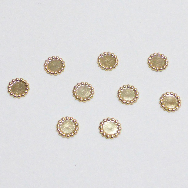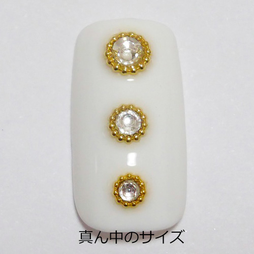【日本製,made in Japan】ネイルパーツ・デコパーツ・ジェルネイルやデコアートに最適♪ネイルパーツ Nail Parts ブリオン囲み風ストーンディッシュスタッズ(30ヶ入)SS7用 ストーンを細かいブリオンで囲む手間を省き、施術時間の短縮にもなる優れもの!!お皿の上にストーンを置くだけで、ブリオンで囲んだような仕上がりに出来ます。お皿にジェルを入れて固めてもかわいいです。 カラー:ゴールド 数量:30個入り サイズ:M、SS7用